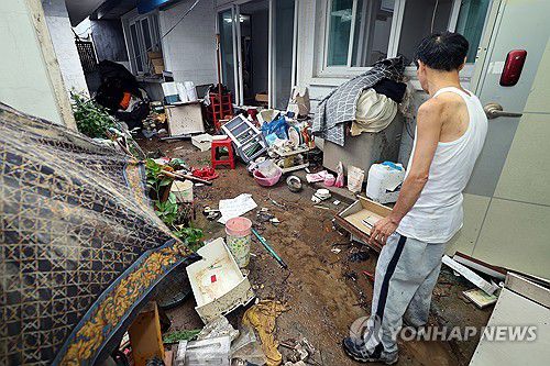 다시 덮친 수마에 주민들 막막(광주=연합뉴스) 김혜인 기자 = 17일만에 극한호우가 다시 내린 4일 광주 북구 신안동 한 주택에서 주민이 흙탕물에 젖은 가재도구를 정리하고 있다. 2025.8.4 in@yna.co.kr