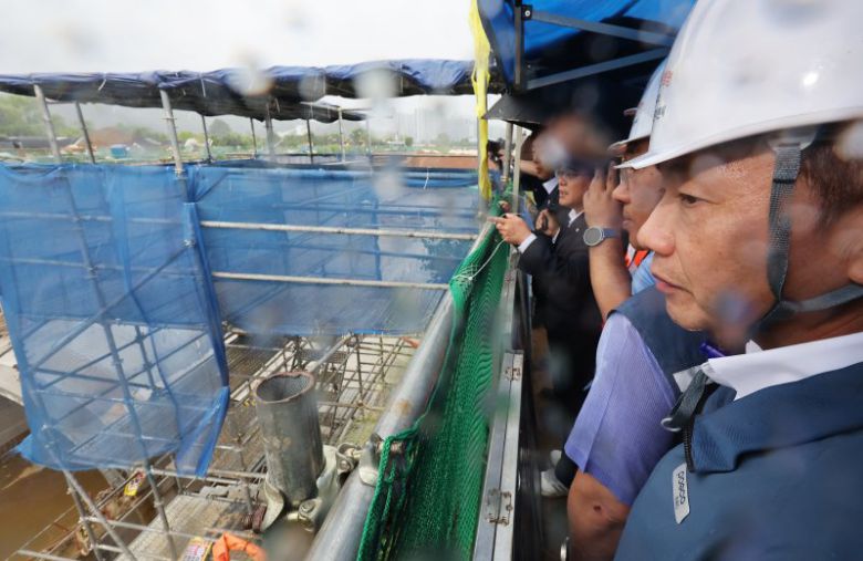 6일 송치영 포스코이앤씨 신임 사장이 작업자가 중상을 입고 의식불명에 빠진 사고가 발생한 경기도 광명시 포스코이앤씨 고속도로 건설공사 현장에서 더불어민주당 을지로위원회 위원들과 사고 현장을 살펴보고 있다. 연합뉴스