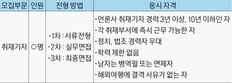경향신문사가 취재기자 경력사원을 모집합니다 . 경향신문은 사원이 주인입니다. 권력과 자본에 속박되지 않은 채 우리 사회가 올바른 방향으로 나아갈 수 있도록 뉴스를 깊이 있게 분석하고, 쉽고 정확하게 전달하기 위해 노력하고 있습니다.