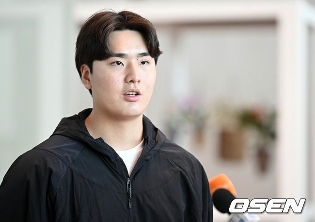 [OSEN=인천공항, 조은정 기자] 피츠버그 파이리츠와 입단 계약에 합의한 심준석이 24일 오후 인천국제공항을 통해 피츠버그로 출국했다. 심준석이 출국을 앞두고 인터뷰를 하고 있다. 2023.01.24 /cej@osen.co.kr