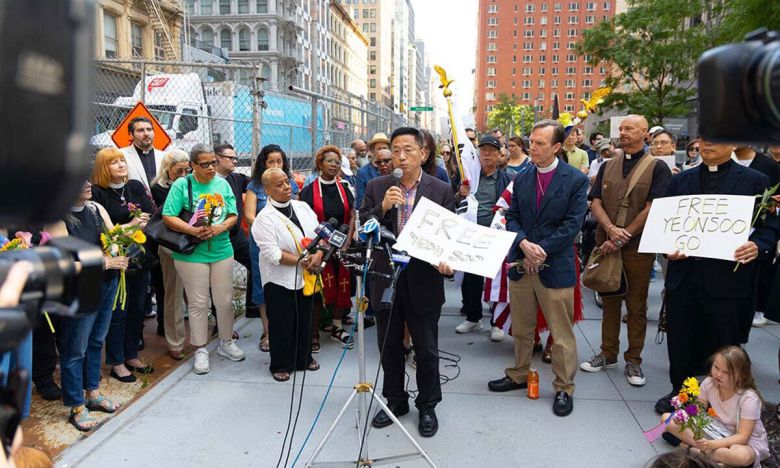 고연수씨 석방촉구 기자회견 발언하는 이명석 뉴욕한인회장. 뉴욕한인회 제공 |