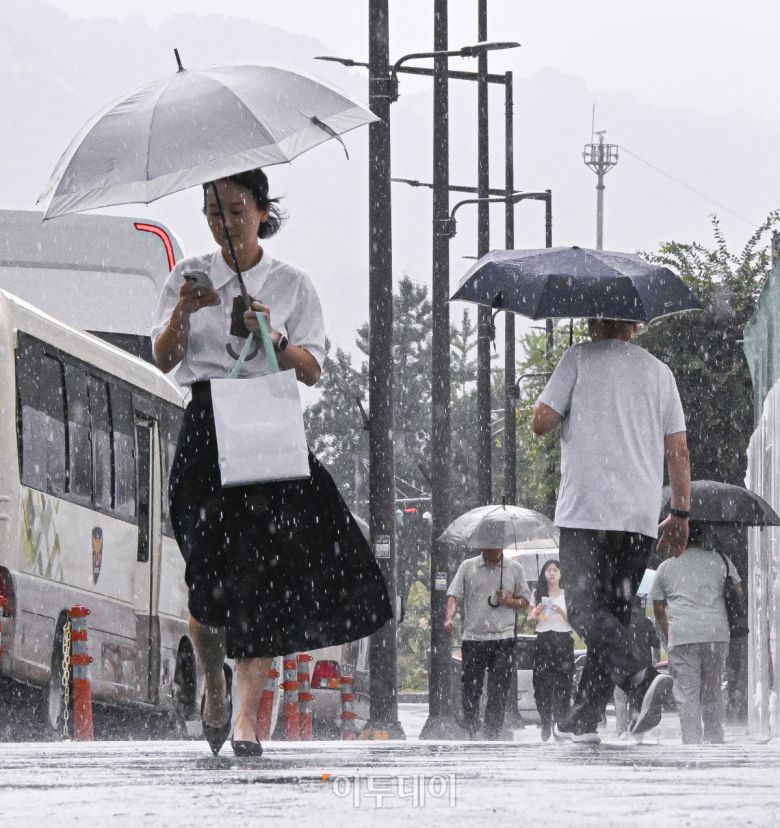 전국 대부분 지역에 돌풍과 함께 천둥·번개를 동반한 많은 비가 내린 6일 서울 종로구 광화문역 일대에서 우산을 쓴 시민들이 내리는 비를 피해 발걸음을 재촉하고 있다. |