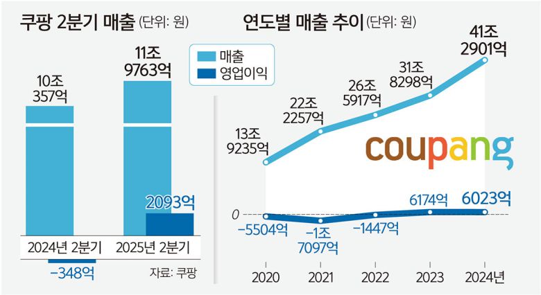 쿠팡 모기업 쿠팡Inc는 올해 2분기 매출이 11조9763억원(85억2400만달러·평균환율 1405.02원)으로 전년(10조357억원)보다 19% 늘었다고 6일 밝혔다.