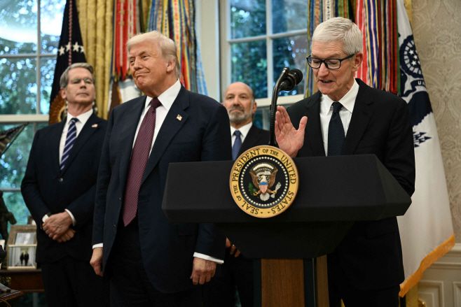 팀 쿡 애플 최고경영자(CEO·오른쪽)가 7일(현지시간) 미국 워싱턴 D.C. 백악관에서 미국에 대한 투자 계획을 발표하고 있다. 이를 도널드 트럼프 대통령(세번째)이 미소를 지으면서 듣고 있고, 하워드 러트닉 상무장관(두번째)·스콧 베선트 재무장관이 지켜보고 있다./AFP·연합 |