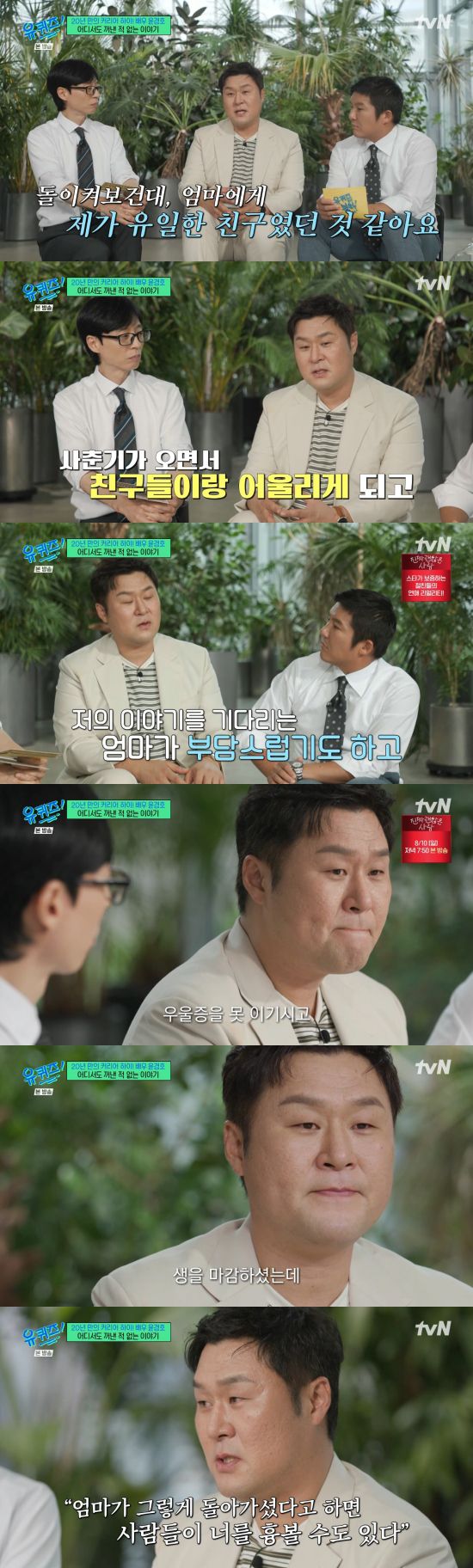 윤경호는 "엄마는 항상 저의 이야기를 기다리고 계셨는데 때로는 그게 너무 부담스럽기도 하고 친구들이랑 더 놀고 싶고 아이들이 사춘기가 오면 부모는 사추기라고 또 다른 외로움과 그런 게 찾아온다고 '엄마가 사추기가 왔나 봐. 난 너랑 계속 이야기 나누고 싶어' 하면서 항상 저를 기다려 줬는데 알고 봤더니 우울증이 심하셨던 거 같다"라며 밝혔다.