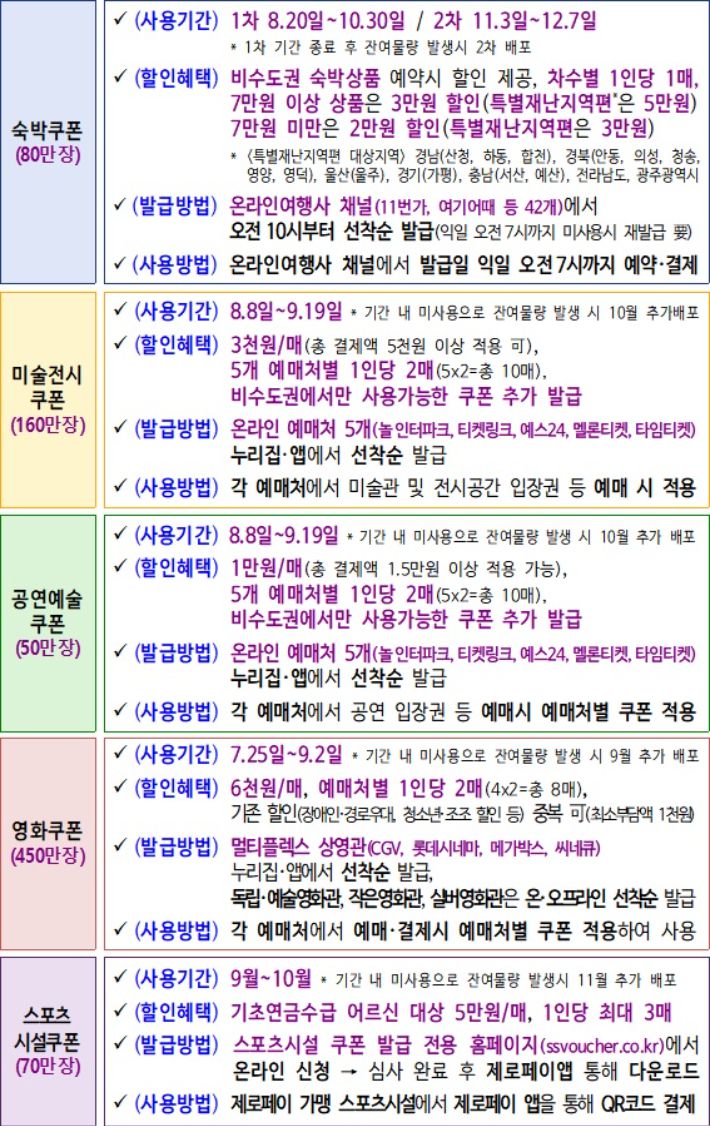 우선 숙박쿠폰 등 5대 문화소비쿠폰 810만 장을 지급하는 한편, 지방에서 집중사용하도록 유도하기로 했다. 당장 지난달 25일부터 지급하기 시작한 영화쿠폰 450만 장을 필두로 이번 달 내에 미술전시쿠폰(160만 장), 공연예술쿠폰(50만 장), 숙박쿠폰(80만 장), 스포츠시설쿠폰(70만 장) 등을 지급한다.