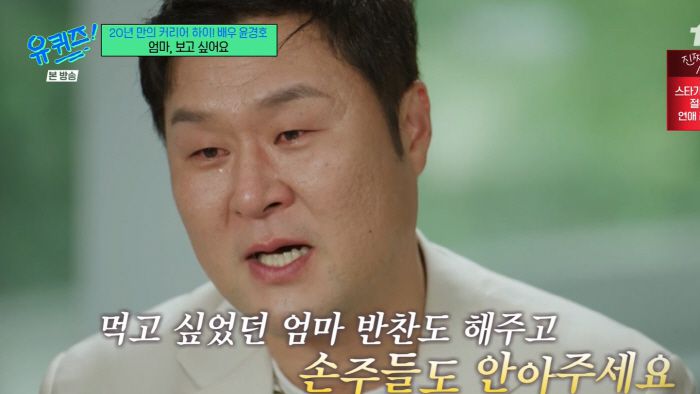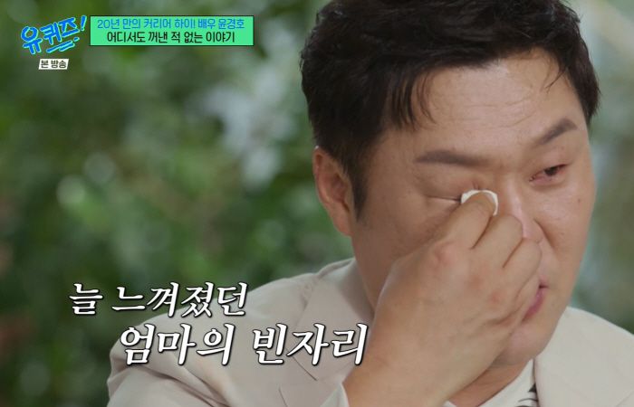 마지막에 윤경호는 돌아가신 엄마에게 영상편지를 전했다. "엄마 나 '유퀴즈' 나왔어. 나중에 내가 엄마 곁으로 다시 가게 됐을 때 먹고 싶었던 엄마 반찬도 해주고 손주들도 안아주세요. 손주들은 늦게 와야겠지. 보고싶어요"라고 남겼다.