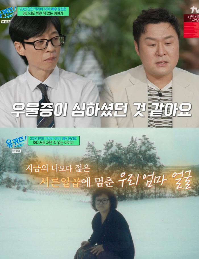 윤경호는 "엄마에게 제가 유일한 친구였던 것 같다. 제가 사춘기가 오면서 다른 친구들과 어울리게 되고 어느 순간 엄마가 귀찮아졌다. 엄마는 저를 항상 기다렸는데 때로는 그게 부담스러웠다"며 "몰랐는데 당시 엄마가 우울증이 심하셨었다. 결국은 스스로 생을 마감하셨다"고 말하며 눈물을 흘렸다. 이어 "그런 아픔이 있는 분들이 많이 계시지 않나. 당시에 외할머니도 '엄마가 그렇게 돌아가셨다고 하면 사람들이 너를 흉 볼 수 있다'고 해서 한번도 엄마가 돌아가신 이유를 말한 적이 없다. 그런데 오늘 이 자리에서 말하고 싶다. 좋은 일이 생기면 엄마에 대한 공허함이 크다. 그렇게 진심으로 리액션을 해주는 사람이 없었다. 제게 늘 엄마의 빈자리는 크다. 제일 저를 잘 아시는 분이다. 저는 아직도 제가 태어난 시를 모른다. 내 태어난 시를 유일하게 알고 계실 분"이라고 그리워했다.