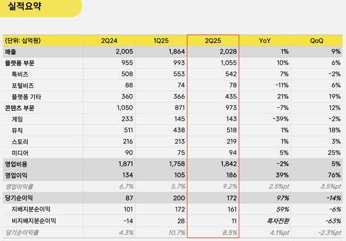사업 분야별로 보면, 전체 플랫폼 부문의 매출은 지난해 2분기보다 10% 증가한 1조552억원으로 집계됐다. 모빌리티와 페이 사업 등이 포함된 ‘플랫폼 기타’ 매출액이 지난해 같은 기간 대비 21% 증가한 4348억원이다. 모빌리티는 주차와 퀵 서비스 사업 확장으로 매출 성장을 이끌었고, 페이는 금융·플랫폼 서비스 고성장에 힘입어, 한해 전과 비교해 두 자릿수 매출 성장률을 기록했다. 플랫폼 부문 매출 가운데 가장 큰 비중을 차지하는 ‘톡비즈’는 지난해 같은 기간보다 7% 증가한 5421억원을 기록했다.