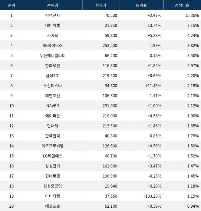 이 밖에도 에이피알(278470) ▲4.56%, 현대차(005380) ▲1.43%, 한국전력(015760) ▼0.85%, 에코프로비엠(247540) ▲0.56%, LG씨엔에스(064400) ▲1.78%, 삼성전기(009150) ▲3.47%, 현대로템(064350) ▼0.25%, 삼성중공업(010140) ▲0.20%, 아이티켐(309710) ▲133.23%, 에코프로(086520) ▲0.39% 등이 많이 검색되고 있다.
