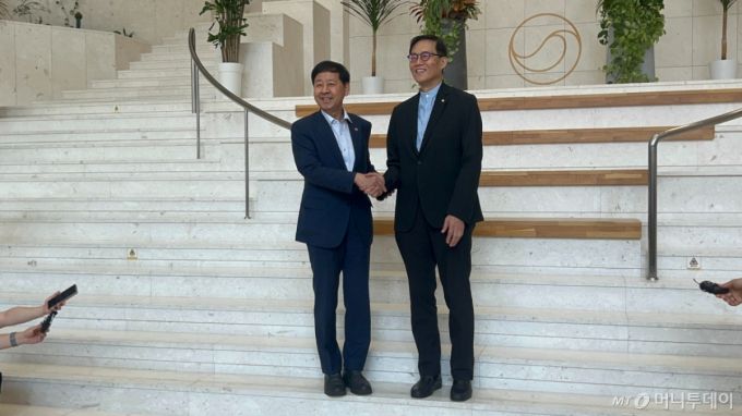 구윤철 부총리 겸 기획재정부 장관(사진 왼쪽)이 7일 한국은행을 방문해 이창용 한은 총재(오른쪽)과 만나 악수하고 있다/사진=김주현 기자