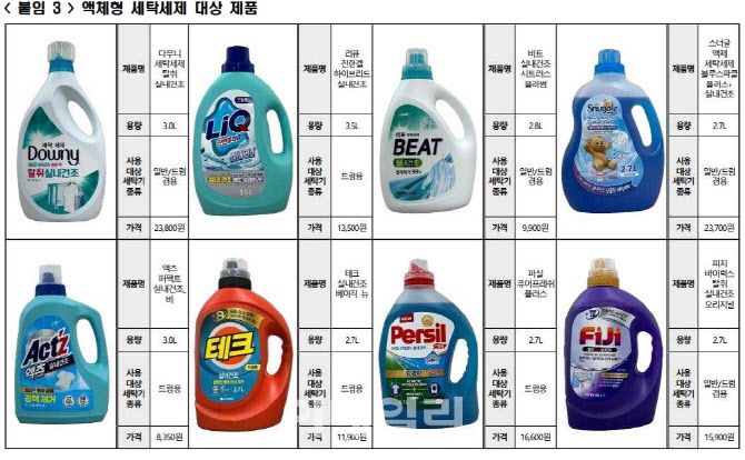 대상 제품은 △다우니 세탁세제 탈취실내건조(다우니) △리큐 진한겔 하이브리드 실내건조(리큐) △비트 실내건조 시트러스 블라썸(비트) △스너글 액체 세탁세제 블루스파클 플러스+실내건조(스너글) △액츠 퍼펙트 실내건조_비(액츠) △테크 실내건조 베이직 뉴(테크) △퍼실 퓨어프레쉬 플러스(퍼실) △피지 바이러스 탈취 실내건조 오리지널(피지)이다.
