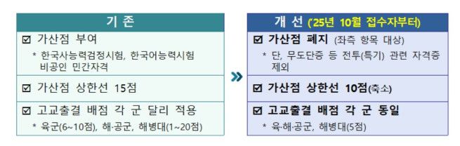먼저 병무청은 10월 모집병 접수부터 군 임무수행과 관련이 적은 한국사능력검정시험 및 한국어능력시험 가산점 2종을 없애기로 했다. 무도단증 등 전투(특기)와 관련있는 자격증 외 비공인 민간자격도 모두 폐지했다. 상한선도 당초 15점에서 10점으로 낮췄다. 육·해·공군 및 해병대가 각각 달리 적용했던 고교 출결 배점도 모두 5점으로 축소 통일했다.