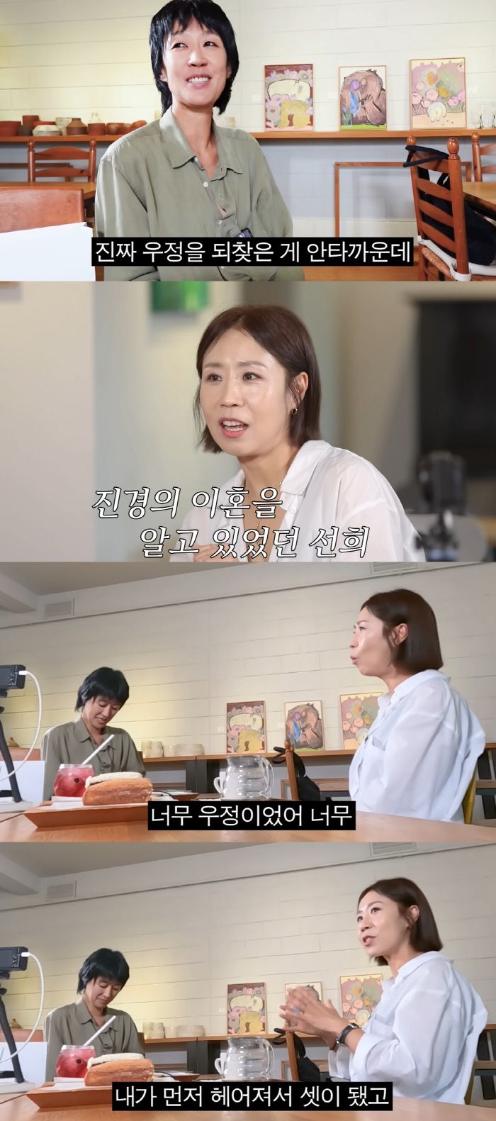 '이혼하게 된 결정적인 계기'에 홍진경은 "한 사람의 잘못은 아니다. '다들 그러고 살아. 그렇다고 다 이혼하냐'고 한다면 할 말 없지만, 이건 우리의 개인적인 선택이다. 우리는 그 부분이 힘들다. 사람마다 힘든 부분이 다를 수 있지 않냐"고 전했다. 정선희는 "둘이 합의가 되면 끝인 거다"라고 끄덕였다.