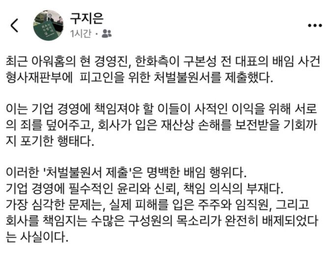 구지은 전 부회장은 "이러한 '처벌불원서 제출'은 명백한 배임 행위다. 기업 경영에 필수적인 윤리와 신뢰, 책임 의식의 부재다"며 "권한이 클수록 모범을 보여야 함에도, 회삿돈을 사적으로 유용하고 그 책임을 회피하기 위해 서로 뜻을 맞추는 일이 21세기에도 벌어지고 있다는 점이 참담하다"고 지적했다.