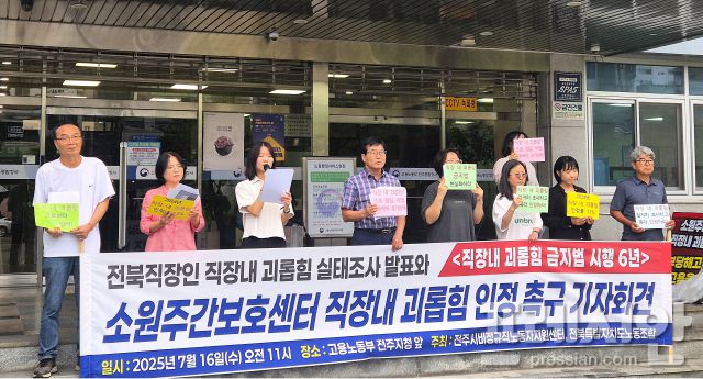 ▲전주시비정규직노동자지원센터와 전북특별자치도노동조합이 2025년 7월 16일 오전 고용노동부 전주지청 앞에서 '전북 소원주간보호센터 직장 내 괴롭힘 인정 촉구' 기자회견을 갖고 있다. ⓒ프레시안 |