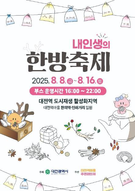 동시에 진행되는 '내 인생의 한방 축제'는 대전역 일대 중동, 정동, 삼성동 등 도시재생 활성화 지역을 무대로 열린다. 전통 한의약 문화와 지역 이야기를 엮은 주민 주도형 축제로, 이색적인 체험과 전시, 마을의 따뜻한 정취가 어우러지는 것이 특징이다.
