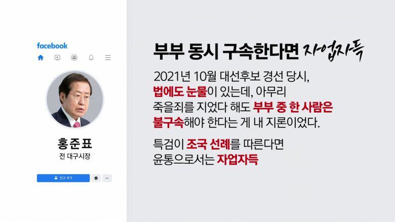 홍준표 전 대구시장은 지난 2021년 10월 대선후보 경선 당시 윤석열 후보에게 조국 전 대표 부부를 모두 구속한 것은 가혹하지 않느냐고 물었던 것을 회상하며, 특검이 조국 선례를 따른다면 윤 전 대통령으로서는 '자업자득'이라고 표현했는데요.