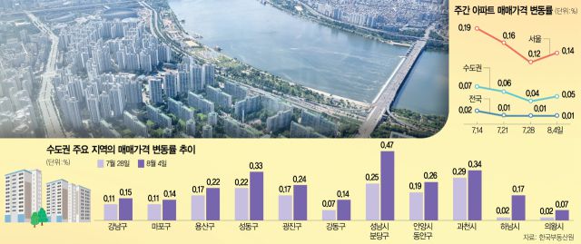 7일 한국부동산원의 8월 첫째 주(4일 기준) 주간 아파트 매매가격 동향조사 결과에 따르면 서울 상승 폭은 지난주 0.12%에서 이번 주 0.14%로 확대됐다. 서울 아파트 매매가격 상승 폭이 확대된 것은 6월 마지막 주 이후 6주 만이다. 전국 아파트값의 상승 폭은 0.01%를 유지했다. 수도권(0.04%→0.05%)은 상승 폭이 커졌지만, 지방(-0.02%→-0.03%)은 하락 폭이 확대됐다.