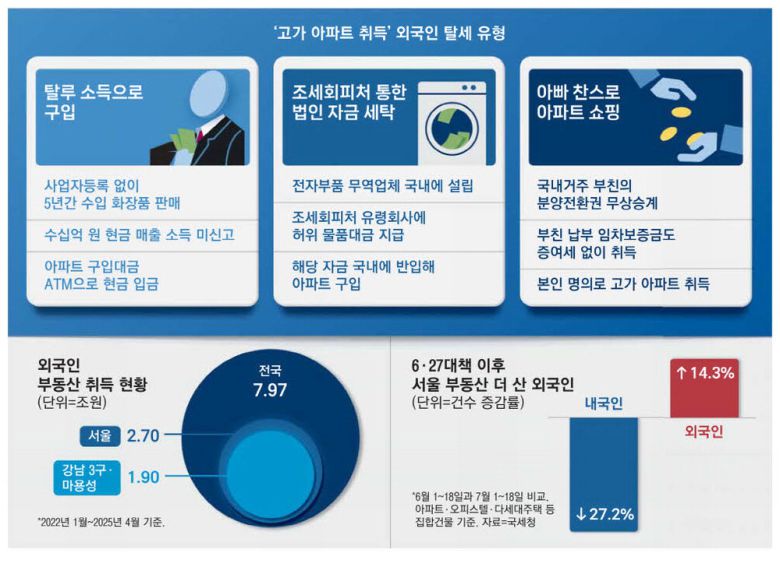 7일 국세청은 국내 아파트를 취득·보유하는 과정에서 각종 편법을 이용해 세금을 회피한 외국인 탈세자 49명에 대해 세무조사를 실시했다고 밝혔다. 탈세 유형은 편법 증여를 이용한 부동산 취득(16명), 탈루소득을 이용한 부동산 취득(20명), 임대소득 탈루(13명) 등이다.