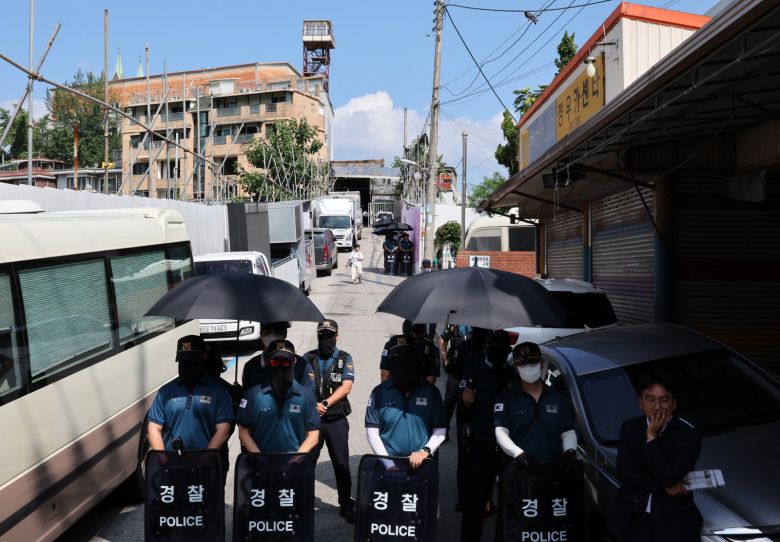경찰이 서부지법 폭력 난동 사태와 관련해 전광훈 목사에 대한 압수수색에 들어간 5일 오전 서울 성북구 사랑제일교회 진입로가 통제되어 있다. 2025.08.05 뉴시스 |