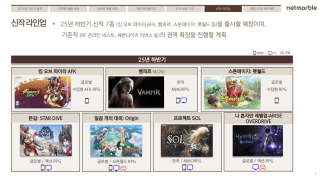 7일 김병규 넷마블 대표는 2025년 2분기 실적발표 컨퍼런스콜을 통해 "올해 하반기 7개 신작 출시와 3개 게임의 권역 확장을 예상하고 있고 충분히 가능하다고 보고 있다"며, "출시일이 연기되지 않을 것으로 단정하기는 어렵지만, 타 게임사들보다 속도감 있게 선택과 집중 전략을 구사할 계획"이라고 전했다.