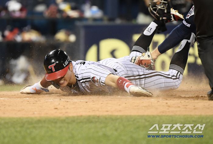 박해민은 헤드퍼스트 슬라이딩으로 미끄러지며 홈을 쓸었다. 신민재도 2루까지 갔다.