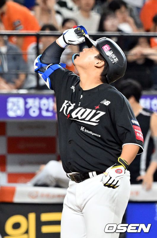 [OSEN=대전, 민경훈 기자] 7일 대전 한화생명볼파크에서 ‘2025 신한 SOL Bank KBO리그’ 한화 이글스와 KT 위즈의 경기가 열렸다. 홈팀 한화는 와이스, KT는 고영표를 선발로 내세웠다. 9회초 1사 주자 2루 KT 강백호가 좌월 역전 투런 홈런을 때린 후 홈을 밟고 있다. 2025.08.07 / rumi@osen.co.kr 이 기사의 카테고리는 언론사의 분류를 따릅니다.0공유하기