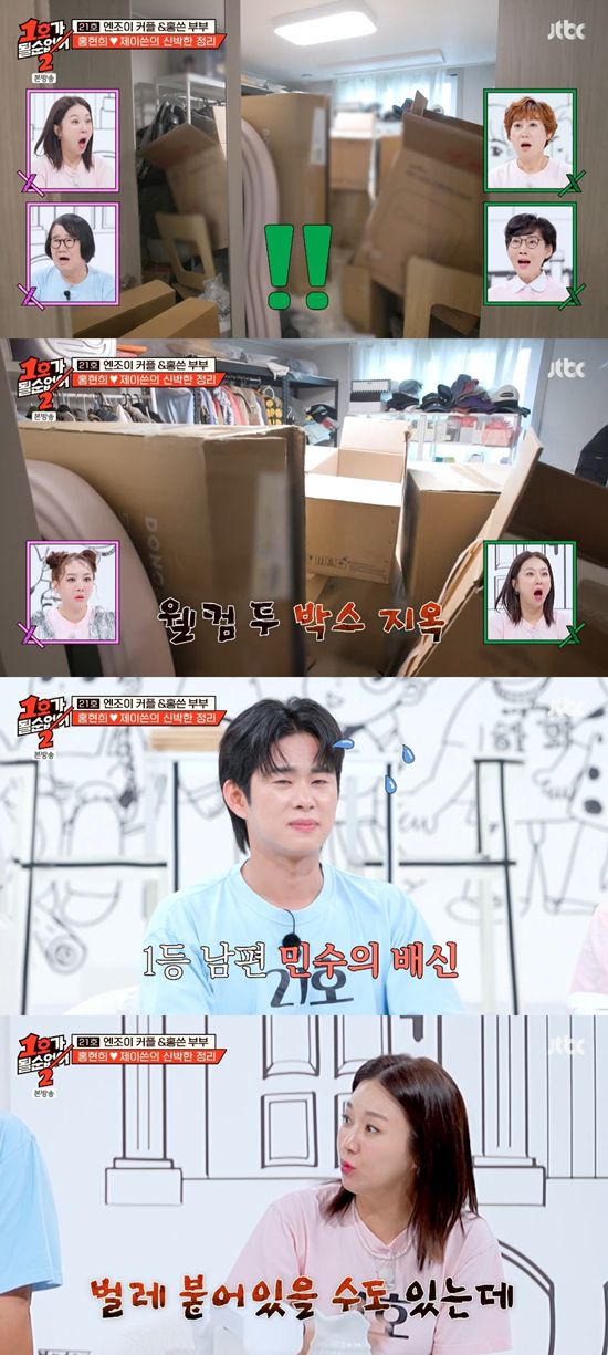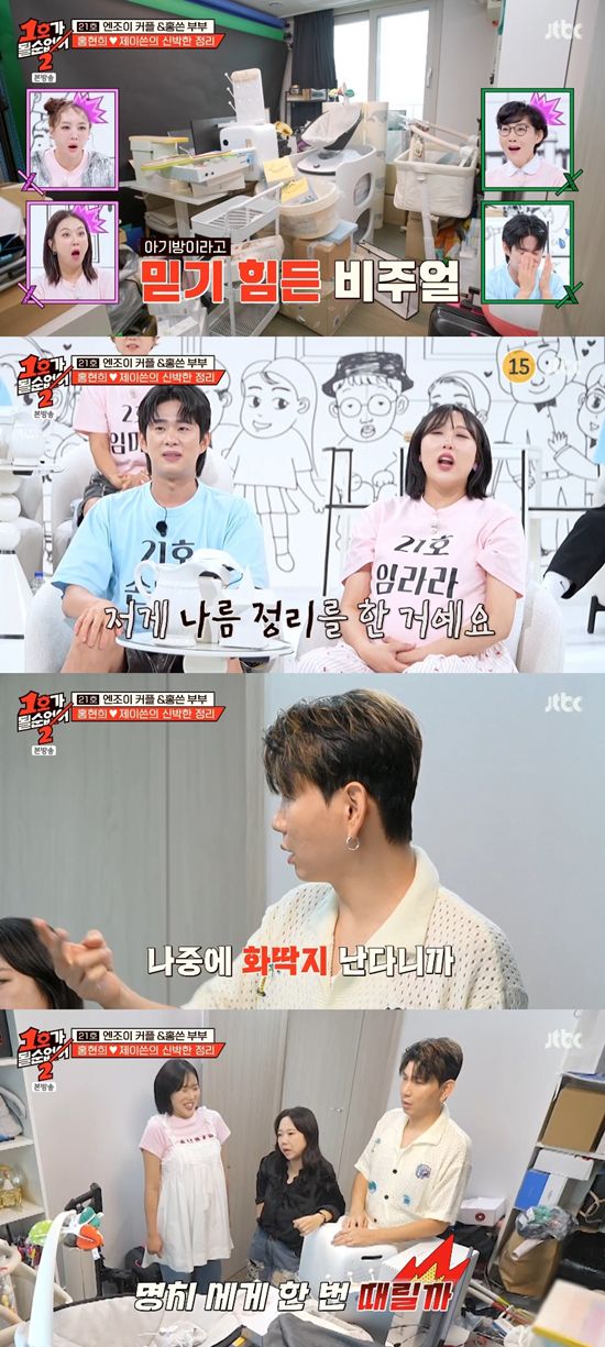 제이쓴은 "이거 안 된다. 다 치워야 된다"라고 조언했다. 이에 임라라는 "민수가 병이 있다. 못 버린다"라고 밝혔다. 홍현희는 "게으르다는 얘기다"라고 일침을 날렸다. 손민수는 "혼자 해결하려고 끙끙 앓았다. 스트레스 줄까 봐 물어보지도 못했다. 최대한 늦추다 보니 아이들이 태어나기 직전까지 왔다"라고 제작진에게 변명했다.