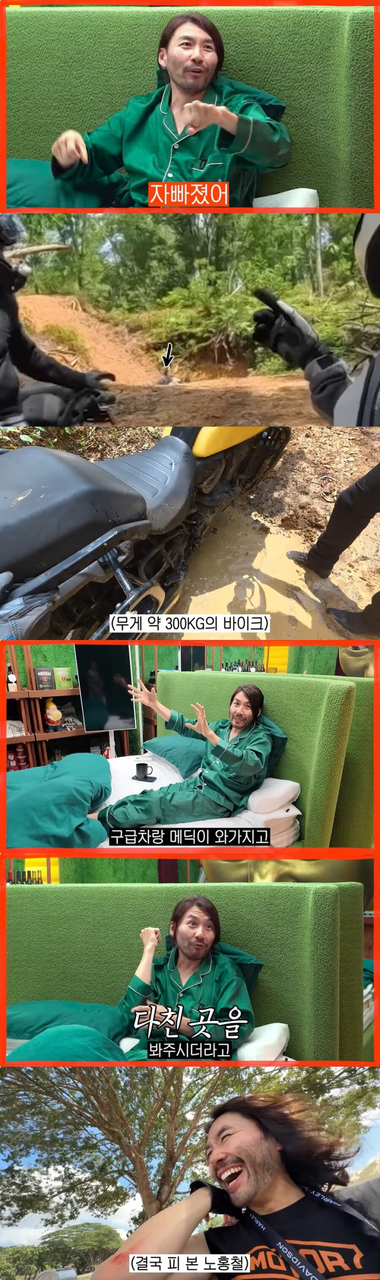 그는 "일행이 바이크를 꺼내주셨고, 구급차와 메딕이 와서 봐주셨다. 노홍철은 "결국 피를 봤다. 이 나이에 이렇게 되네요"라며 진흙 코스 도전을 멈췄다.