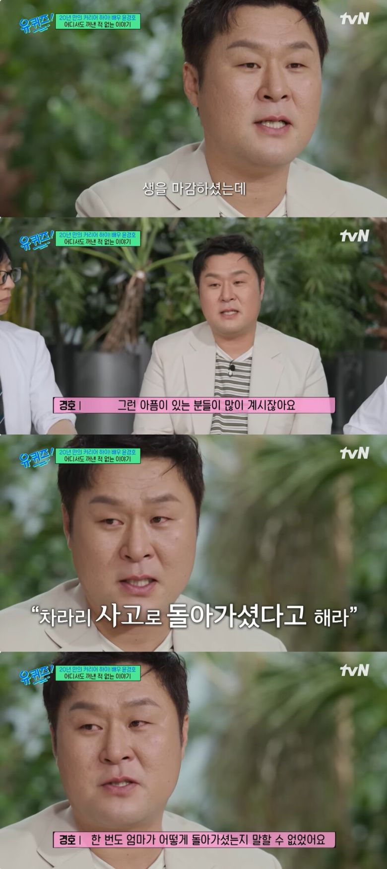 윤경호는 "어머니가 우울증을 못 이기시고 결국에는 스스로 생을 마감하셨다. 사실 그런 아픔이 있는 분들이 많이 있지 않나. 당시 외할머니가 그런 이야기를 하셨다. '경호야 엄마가 그렇게 돌아가셨다고 하면 사람들이 너를 흉보고, 너를 다르게 생각할 수도 있다. 그렇게 돌아갔다고 하지 말고 사고로 돌아가셨다고 해라'라고 하셨다"라며 "그래서 한 번도 엄마가 어떻게 돌아가셨다고 말을 할 수가 없었다"라고 말하며 눈물을 흘렸다.