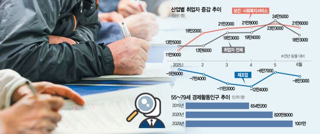 고령층 쏠림 현상도 뚜렷하다. 같은 달 55~79세 경제활동인구는 1001만 명으로 전체의 60.9%를 차지하며 관련 통계 작성 이후 처음 1000만 명을 넘어섰다. 정부 추정에 따르면 직접 일자리의 80% 이상이 65세 이상 노인 일자리로 이러한 확대를 고용의 질적 회복으로 보기는 어렵다는 지적이 나온다.