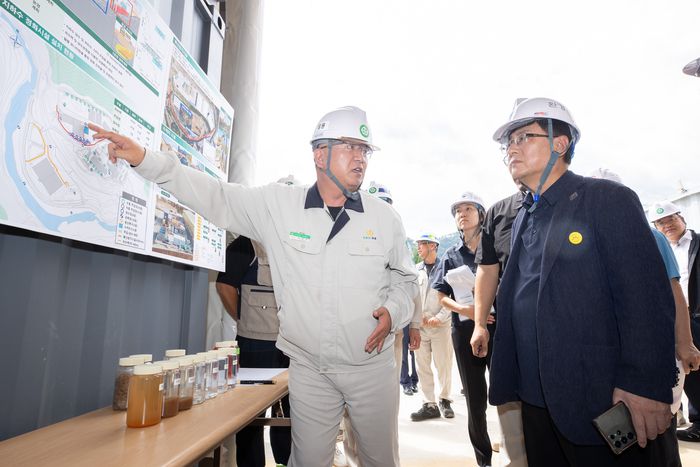 김성환 환경부 장관이 7일 경북 봉화군 영풍 석포제련소를 방문해 환경관리 현황에 대해 듣고 있다. |