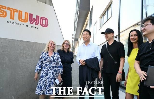 오세훈 서울시장이 지난 7월 2일 오스트리아 '융에스 보넨'의 시공사와 기숙사 운영업체 관계자들과 기념 촬영하고 있다./서울시 |