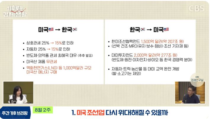 GDP 규모 대비 어떠한지 혹은 무역 흑자 규모 대비 어떠한지 등 양적 비교를 하더라고요. 그래서 누가 더 협상을 잘했느냐에 대한 것은 관점에 따라 달라질 것 같아요. 근데 질적 비교를 해보면 우리나라가 확실히 이 부분은 협상을 잘했다 싶은 부분이 있습니다. 조선업 협력이에요. 대미 투자를 3500억 달러 한다는 것은 큰 금액이잖아요. 이 중에 1500억 달러를 조선업 특화 펀드로 조성한다는 겁니다. 우리 정부가 먼저 미국에 제안한 게 받아들여진 거예요.