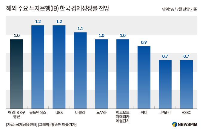 해외 IB 8곳 평균 전망치는 1.0%로 집계됐는데, 이는 불과 한 달 전인 6월 평균치(0.1%)보다 0.1%포인트(p) 오른 수치다.