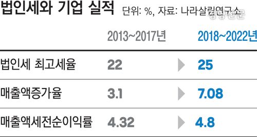 그 결과, 법인세 최고세율이 25%였던 2018~2022년의 기업 성장성, 수익성 지표가 법인세 최고세율이 22%였던 2013~2017년보다 높았던 것으로 나타났습니다.
