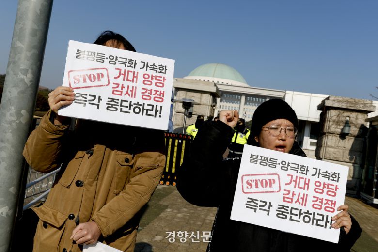 윤석열 정부 3차 부자감세 저지와 민생·복지 예산 확충 요구 집중행동 소속 노동시민사회단체 활동가들이 지난 2월 26일 국회 앞에서 감세정책 실패 반복하는 거대 양당을 규탄하는 기자회견을 열고 있다. 문재원 기자 |