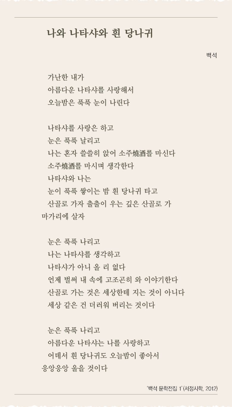 그중에서도 가장 오래도록 붙들고 있던 시는 ‘나와 나타샤와 흰 당나귀’였다. 이 시를 읽기 시작하자마자 나는 곧장 눈이 “푹푹” 쏟아지는 어느 밤 한가운데에 놓여 있었다. “가난한 내가/ 아름다운 나타샤를 사랑해서” 희게, 소복하게, 그러나 말없이 “푹푹” 눈 내리는 장면을 마주했다. 오로지 “나타샤”만을, “나타샤”와 함께 “깊은 산골”로 떠날 생각만을 하는 ‘나’가 되었다. ‘나’에게 “고조곤히 와”서 “산골로 가는 것은 세상한테 지는 것이 아니”며 “세상 같은 건 더러워 버리는 것”이라고 단호하게 말하는 “나탸샤”를, “아니 올 리 없다”던 “나타샤”를, 끝내 나타나지 않는 “나타샤”를 그리워했다. “나타샤”에 대한 ‘나’의 마음이 진짜 내 것도 아니면서 그랬다. 누군가를 사랑한다는 건 참 좋은 일이구나, 멋진 일이구나 싶었다. 그런 걸 시로 써낸다는 건 어떤 걸까 궁금해졌다.