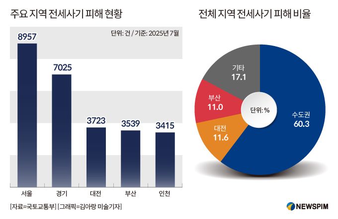 전세사기 피해 지역은 수도권에 집중됐다. 서울, 경기, 인천 등 수도권 지역의 전세사기 피해가 1만9000건이 넘으면서 전체의 60.3%로 과반을 차지했으며 대전이 11.6%, 부산도 11.0%로 두 자릿수 비율을 기록했다.