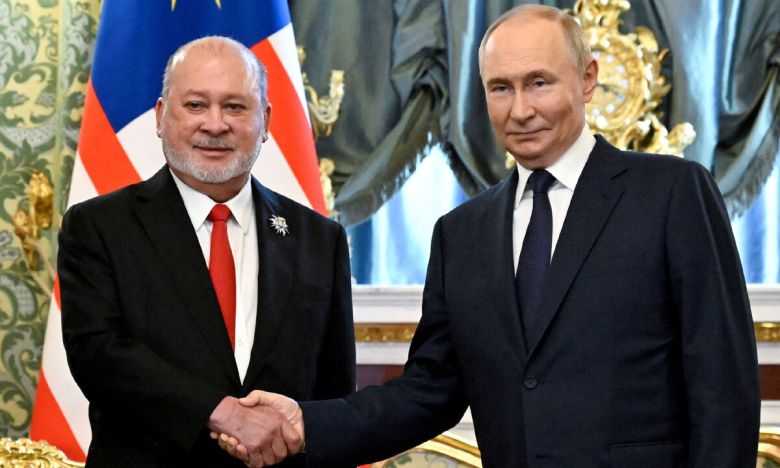 러시아를 국빈 방문 중인 이브라힘 이스칸다르 말레이시아 국왕(왼쪽)이 6일(현지시간) 크레믈궁에서 블라디미르 푸틴 러시아 대통령과의 정상회담에 앞서 악수를 나누고 있다. 로이터연합뉴스