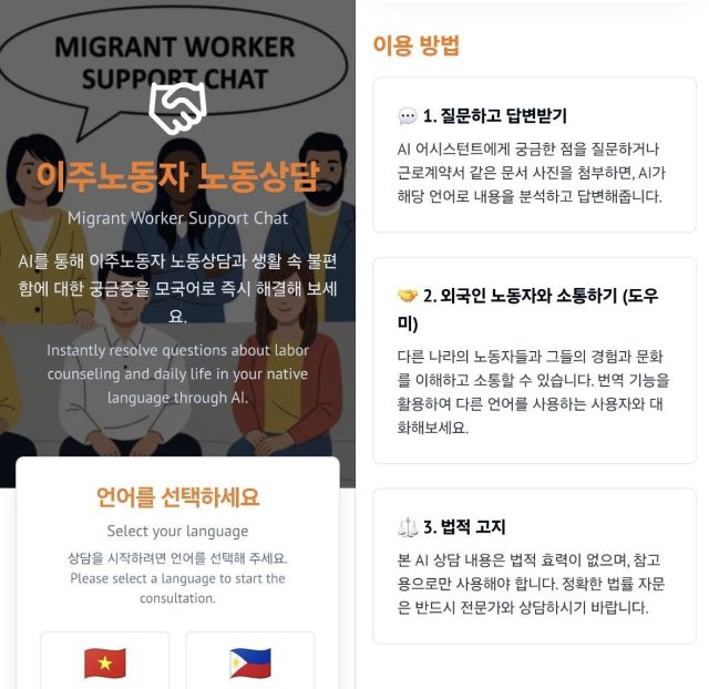 AI 다국어 상담 기능을 갖춘 무료 이주노동자 지원 사이트(migrant.ai.kr)가 지난 1일 공개됐다. '비정규 이주노동자를 위한 개발자 모임'이 만든 사이트는 공개 일주일 만에 1000여 건의 상담 문의가 폭주할 정도로 이주노동자들 사이에서 엄청난 호응을 얻고 있다.