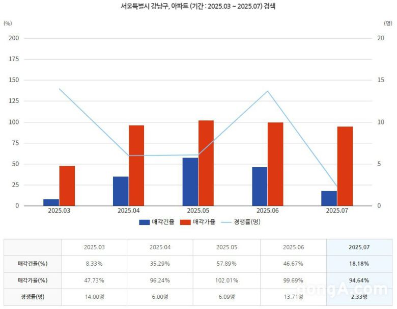 반면, 최고 인기 지역인 서울 강남 아파트 경매 시장은 하락세가 뚜렷하다. 2025년 3월부터 7월까지 최근 5개월간 강남 아파트 경매 경쟁률은 크게 줄었다. 3월 평균 14.00명이던 경쟁률은 7월 2.33명으로 급감했다. 4월과 5월에는 각각 6.00명, 6.09명으로 다소 완만한 흐름을 보였지만, 6월 일시적 반등(13.71명) 이후 7월에 다시 하락하며 전반적인 감소 추세가 확인됐다.