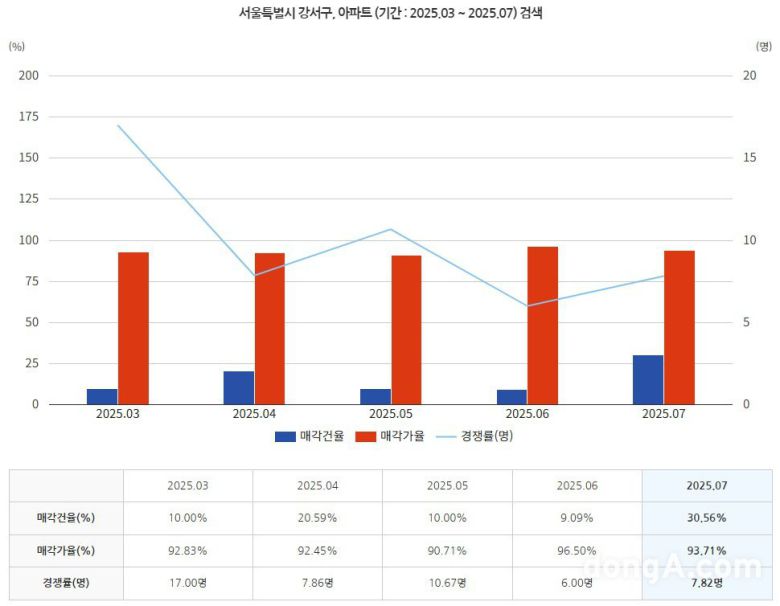 취재진이 부동산 경매 플랫폼 옥션원 통계 자료를 분석한 결과 2025년 7월 강서구 아파트의 매각가율은 93.71%로, 5월(90.71%) 대비 올랐다. 평균 감정가는 약 8억5800만 원 수준으로, 10억 원 이하 매물에 응찰자가 집중되고 있는 양상이다. 매각건율(낙찰된 물건의 비율)은 7월 30.56%로 급등했다. 경쟁률은 7.82명으로 전월(6.00명) 대비 소폭 늘었다. 대출 규제로 고가 매물 접근은 줄었지만, 중저가 매물 위주로 실수요자 수요가 증가하고 있는 상황이다.