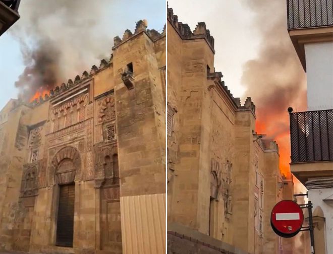 8일(현지시간) 스페인 남부 도시 코르도바에 위치한 메스키타 대성당에서 화재가 발생한 뒤 불길이 치솟고 있다. 엑스(X) 캡처