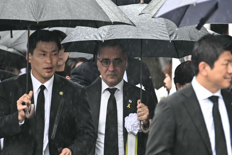 큰 비가 내린 9일 길라드 코헨 주일 이스라엘 대사가 일본 나가사키 원폭의 날 평화기념식전 행사에 검은 우산을 들고 참석하고 있다. /AFP 연합뉴스 |