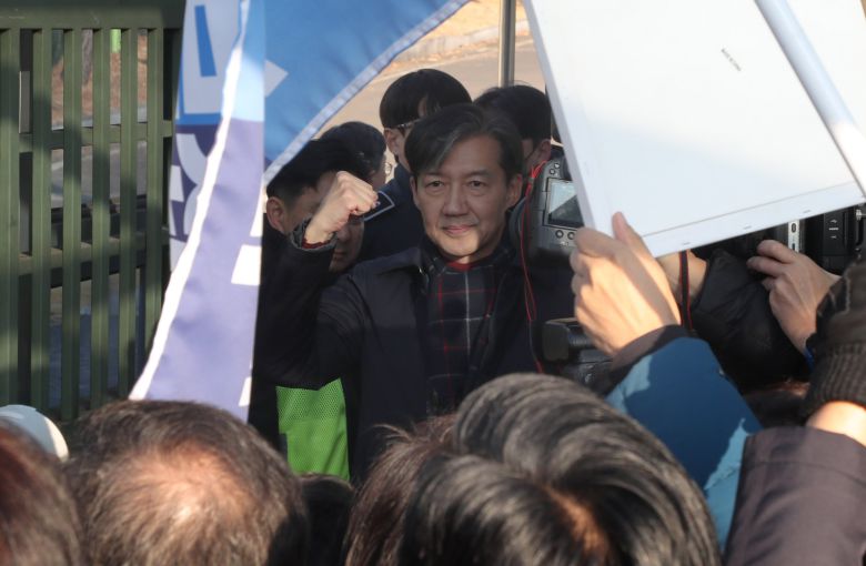 조국 전 장관이 지난해 12월 16일 경기 의왕시 서울구치소에 들어가면서 지지자들에게 주먹을 들어 인사하고 있다. /전기병 기자 |