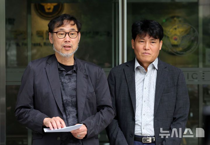 [서울=뉴시스] 홍효식 기자 = 김순환(오른쪽) 서민민생대책위원회(서민위) 사무총장이 9일 서울 마포구 서울경찰청 금융범죄수사대에서 이춘석 주식 차명거래 의혹 고발인 조사에 출석하고 있다. 2025.08.09. yesphoto@newsis.com