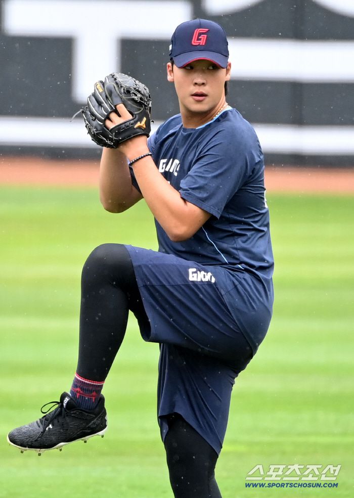 9일 부산 사직야구장에서 열린 SSG와 롯데의 경기, 이민석이 캐치볼을 하고 있다. 부산=허상욱 기자wook@sportschosun.com/2025.08.09/