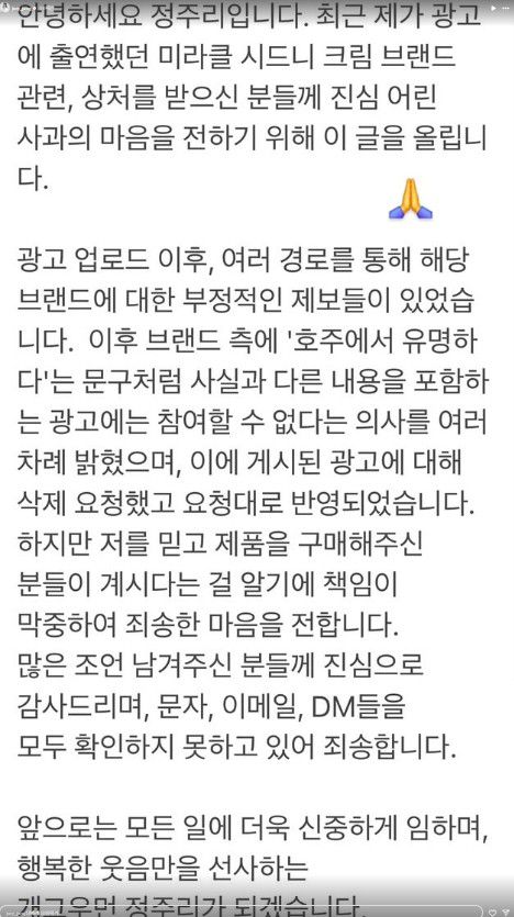 정주리 역시 지난 8일 SNS를 통해 "광고 업로드 이후 해당 브랜드에 대한 부정적인 제보를 여러 경로로 접했다"며 사과했다. 그는 "브랜드 측에 호주에서 유명하다는 문구처럼 사실과 다른 내용을 포함한 광고에는 참여할 수 없다는 뜻을 여러 차례 밝혔다"며 "저를 믿고 제품을 구매해주신 분들이 계시다는 걸 알기에 책임감이 막중하다"고 덧붙였다.